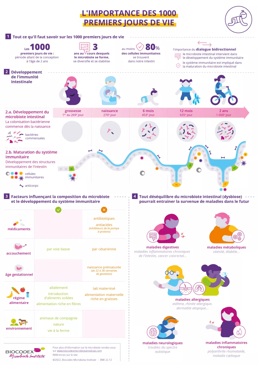 Cette infographie met en avant l'importance cruciale des 1 000 premiers jours de vie d’un nourrisson, de la conception à la petite enfance, dans le développement du microbiote intestinal et de l’immunité intestinale.
