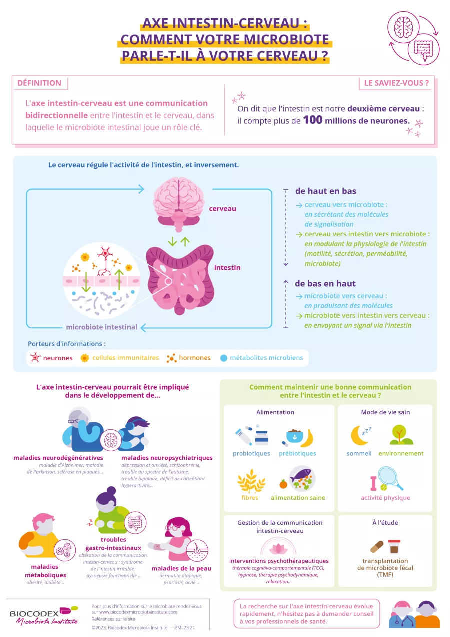 Votre intestin et votre cerveau communiquent en permanence, principalement via le microbiote intestinal. Ce lien influence non seulement la digestion, mais aussi de nombreuses maladies, notamment neurologiques, psychiatriques et métaboliques.