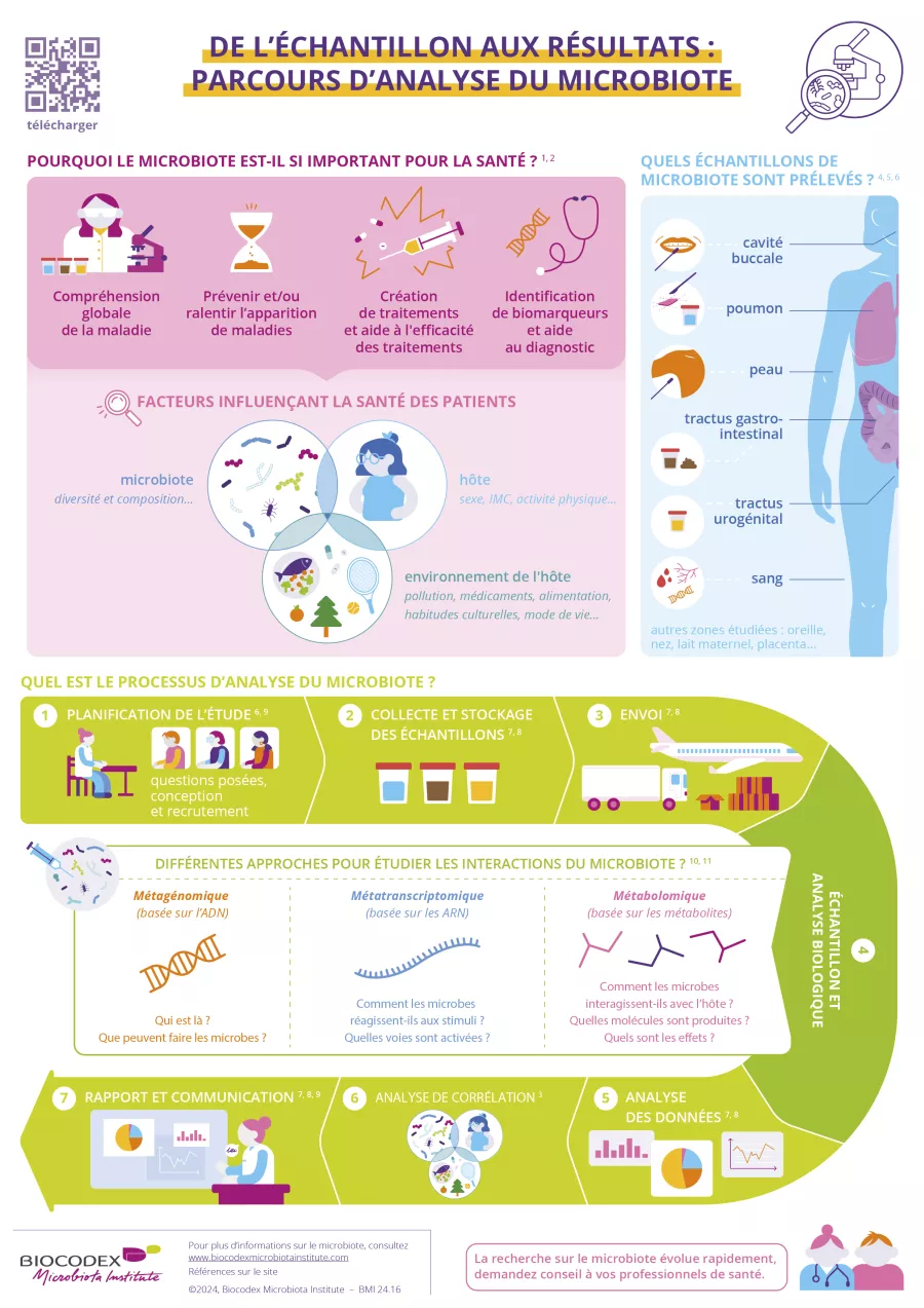 Cette infographie peut être un premier élément de réponse. Elle présente les étapes clés de l’analyse, de la collecte de l’échantillon aux résultats. Simplifiez des processus complexes et découvrez comment les données du microbiote peuvent influencer la santé et les soins personnalisés.