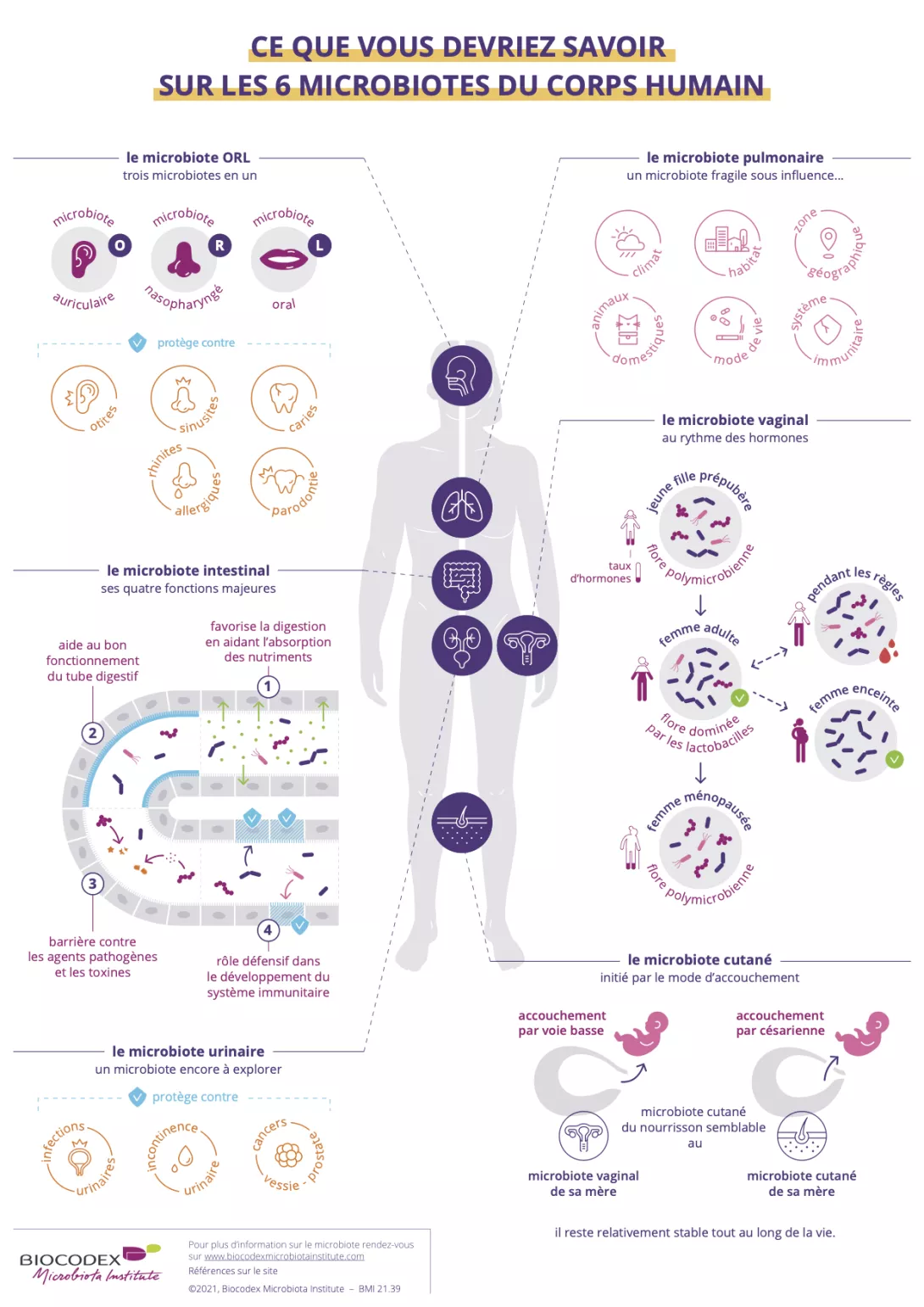 Cette infographie présente les six microbiotes du corps humain, en mettant en avant leurs fonctions et caractéristiques uniques, de l’intestin à la peau.
