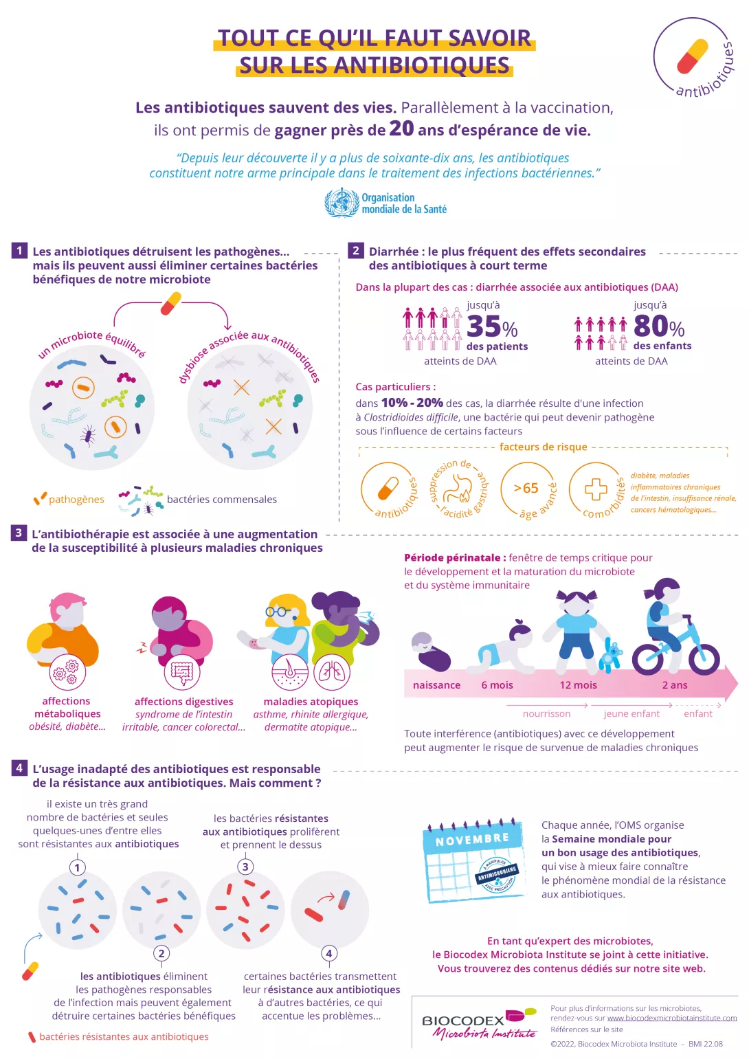 Cette infographie présente les points clés sur les antibiotiques, expliquant comment ils aident à combattre les infections tout en affectant l’équilibre des bactéries bénéfiques du microbiote.