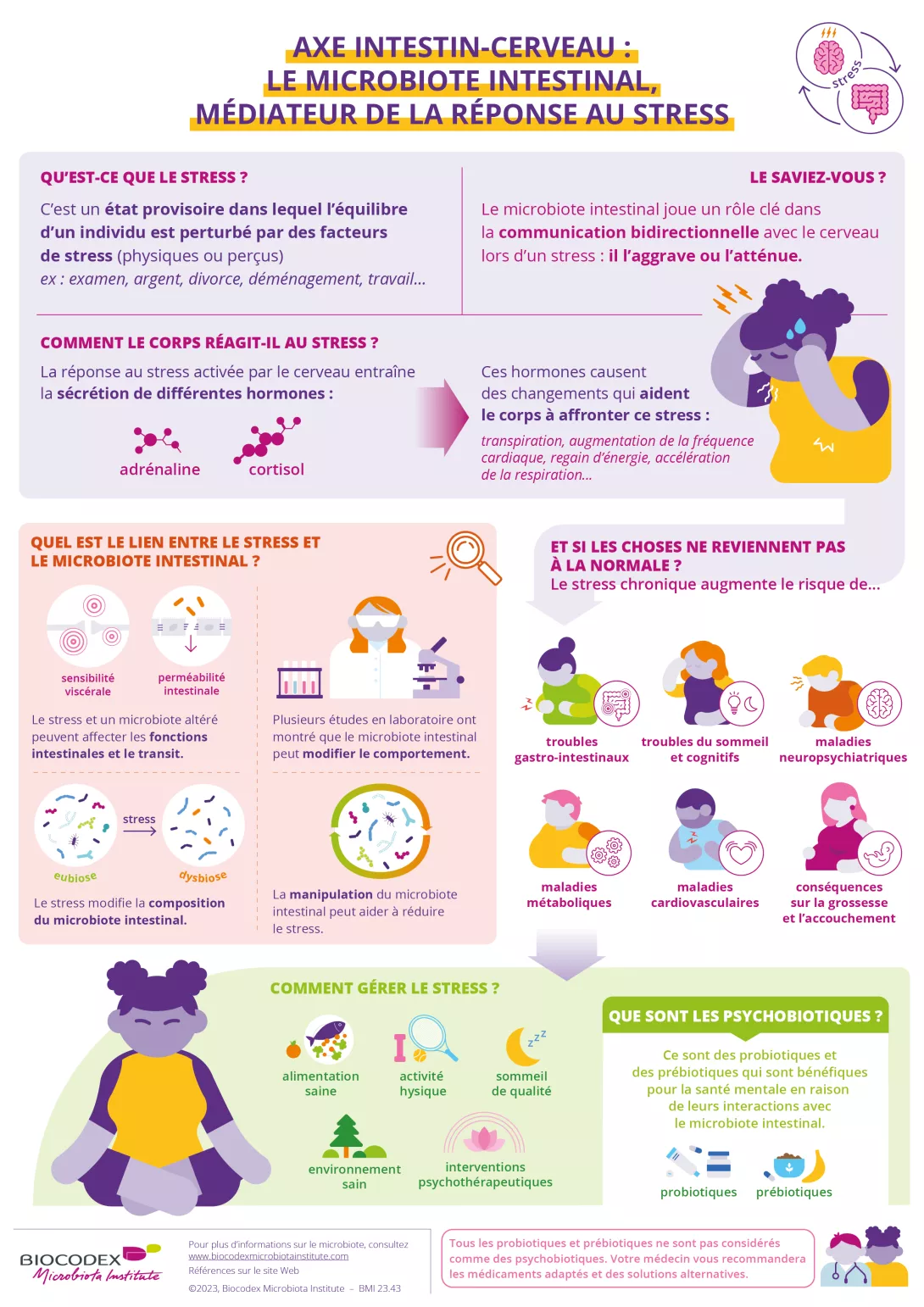 Cette infographie explore le lien entre le microbiote intestinal et le stress, mettant en évidence l’influence de l’axe intestin-cerveau sur le bien-être mental et physique.