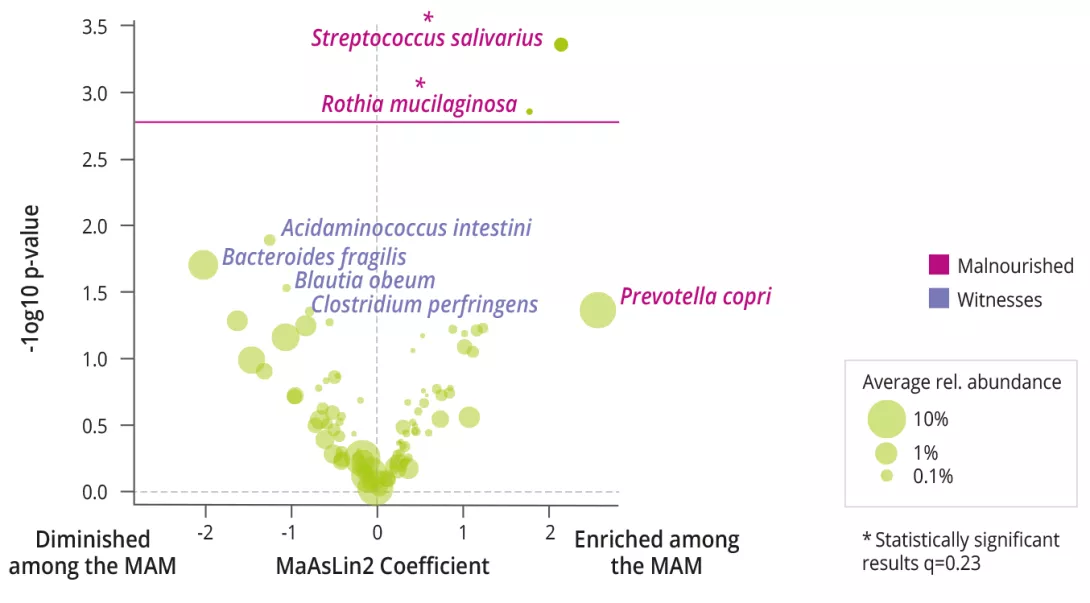 L’analyse multimodale des réseaux a permis de prédire qu’un cluster de B. fragilis, de voies de fermentation du pyruvate, de céramides plasmatiques, d’EEG et de communication expressive était fortement corrélé avec un bon état nutritionnel à 12 mois. Enfin, l’effet le plus fort comme interaction interespèces était observé entre R. mucilaginosa et S. salivarius dont la présence combinée amplifiait la prédiction de MAM à 12 mois.