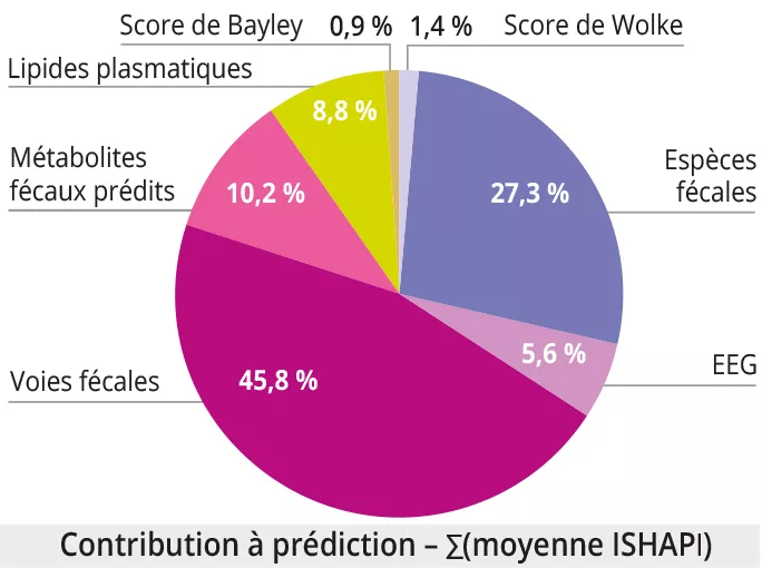 L’intégration des données multimodales a montré que les meilleurs prédicteurs de MAM à 12 mois étaient : 1)les lipides plasmatiques (AUROC = 0,95 ± 0,05) ; 2) les mesures cérébrales et comportementales (score de Wolke, EEG, score de Bayley) (AUROC = 0,73 ± 0,05, 0,71 ± 0,10, 0,68 ± 0,07 respectivement) ; 3) le profil taxonomique, fonctionnel et des métabolites prédits du microbiome fécal (AUROC = 0,56 ± 0,07, 0,53 ± 0,07, 0,52 ± 0,06). À noter la part importante des données liées au microbiome fécal pour prédire la MAM en analyse multimodale, malgré la faible performance du microbiome fécal (figure 3).