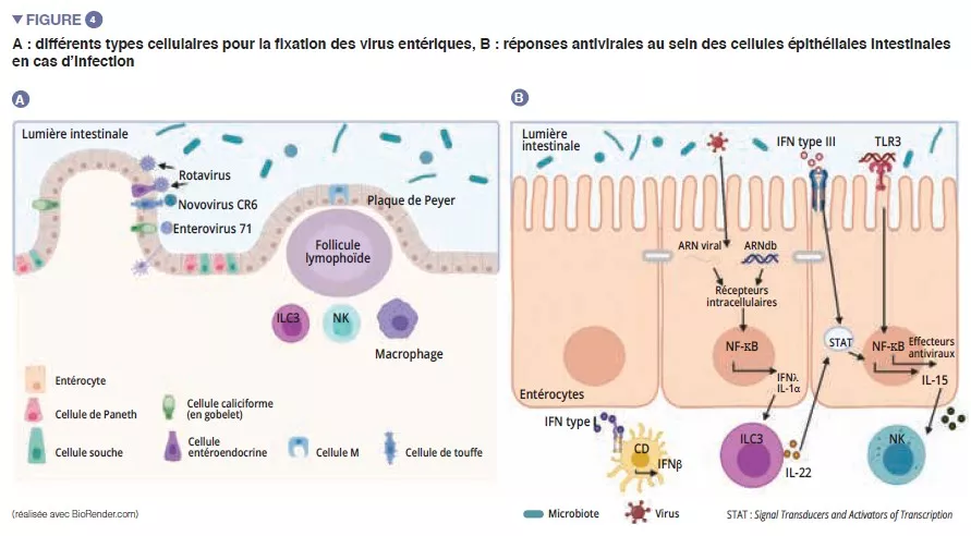 Parmi les virus entériques, le norovirus et le rotavirus sont les principales causes de gastro-entérites [12]. Les virus entériques infectent différents types cellulaires : les entérovirus 71 infectent spécifiquement les cellules caliciformes, tandis que le tropisme des rotavirus est dirigé vers les entérocytes principalement [13] (Figure 4A). Le microbiote intestinal agit comme une barrière contre les infections virales entériques. Les virus ont évolué et se sont adaptés à leur hôte pour mettre en place des mécanismes qui leur permettent de passer la barrière intestinale et d’échapper à l’immunité de barrière : en effet, il est difficile d’infecter efficacement, par voie orale, les souris par des virus entériques humains [13]. La pénétration du virus dans l’entérocyte entraîne la sécrétion d’interféron (IFN) de type III. La détection virale peut induire IL-la qui active les ILC3 pour produire l’IL-22. Cette IL protège des infections virales entériques et agit en synergie avec les IFN de type III pour induire l’expression d’effecteurs antiviraux et d’IL-15. La reconnaissance virale par les TLR-3 conduit à l’activation de la voie NF-kB et également à la production d’IL-15. L’IL-15 active les lymphocytes cytotoxiques (cellules NK). Les virus ayant traversé la barrière intestinale induisent la production d’IFN de type I par les macrophages de la lamina propria (Figure 4B). Certains virus entériques (rotavirus, réovirus, entérovirus) sont capables de se lier aux bactéries intestinales, favorisant la pénétration dans les cellules épithéliales intestinales [13]. Les SFB, qui permettent un renouvellement épithélial, entraînent une protection à l’infection par le rotavirus chez la souris en expulsant les cellules infectées [14]. Les acides biliaires métabolisés par le microbiote intestinal jouent également un rôle en protégeant l’intestin grêle (mais pas le côlon) de l’infection aiguë par le norovirus chez la souris en favorisant la production d’IFN de type III au niveau du grêle [15].