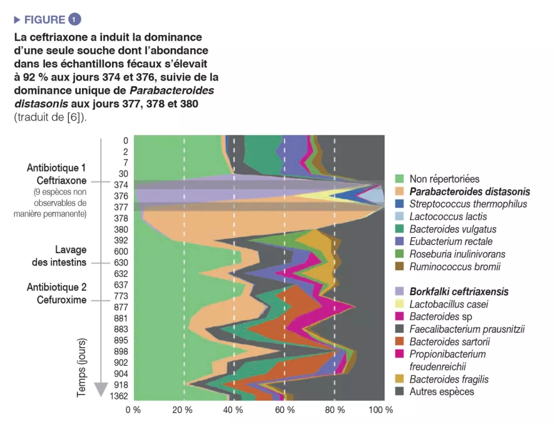 L’administration d’antibiotiques a induit une diminution de la diversité microbienne (perte de richesse de l’écosystème) et une prolifération d’espèces résistantes, ce qui a entraîné une augmentation globale de la charge microbienne (nombre de bactéries par gramme de selles) [5]. Des cas extrêmes de prolifération induite par les antibiotiques ont été rapportés : une souche unique peut devenir prédominante et atteindre une abondance relative de 92 % dans des échantillons fécaux après administration intraveineuse de ceftriaxone [6] (Figure 1).
