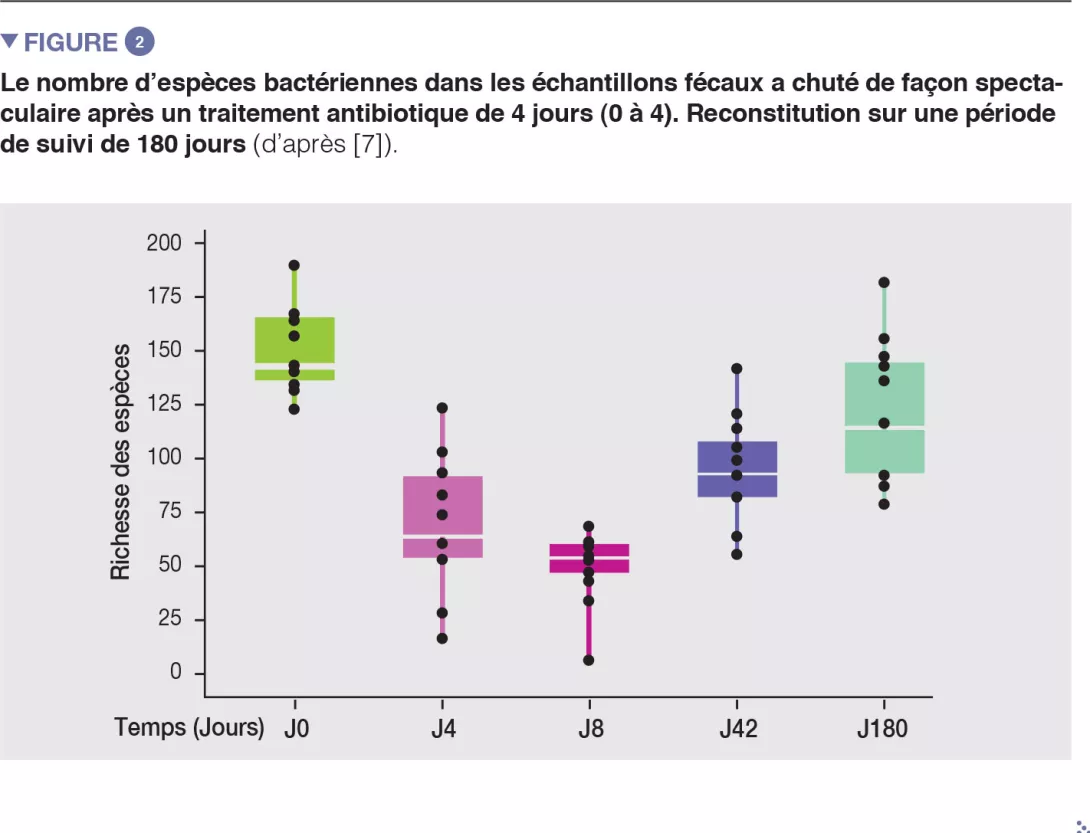 Chez des volontaires sains, une intervention antibiotique de 4 jours a entraîné la prolifération d’entérobactéries et d’autres pathobiontes, comme Enterococcus faecalis et Fusobacterium nucleatum, et la déplétion des bactéries du genre Bifidobacterium et des producteurs de butyrate [7]. Le microbiote intestinal des sujets étudiés est revenu à un état proche de l’état initial en 1,5 mois, bien que 9 espèces, qui étaient présentes chez tous les sujets avant le traitement, soient restées indétectables après 180 jours (Figures 2 et 3).