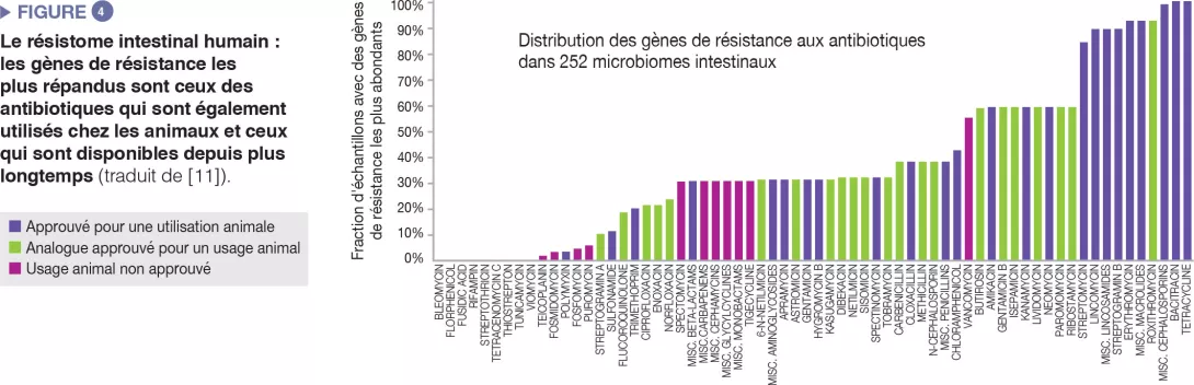 Le microbiome intestinal humain héberge un répertoire divers de gènes de résistance aux antibiotiques, que l’on peut analyser grâce à des technologies de séquençage moléculaire [10]. Une étude portant sur 252 échantillons fécaux humains provenant de différents pays a montré que les gènes de résistance les plus abondants dans le microbiome sont ceux correspondant aux antibiotiques également utilisés chez l’animal et à ceux disponibles depuis longtemps (Figure 4) [11]. Une correspondance a été établie entre les données sur le recours aux antibiotiques chez l’homme et l’animal, et les différences spécifiques à chaque pays ont été observées au niveau de la prévalence des gènes de résistance. Dans l’ensemble, ces données suggèrent l’existence d’une corrélation positive entre l’exposition aux antibiotiques et la prévalence des gènes d’antibiorésistance.