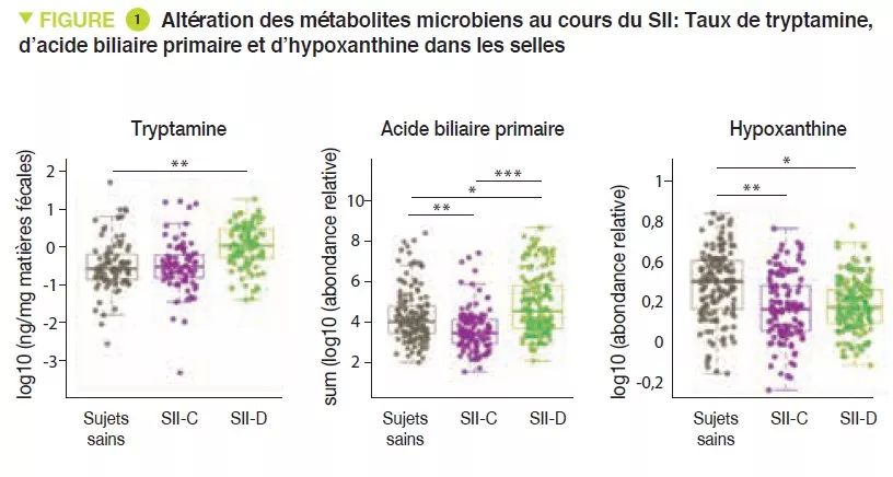 Ici, les auteurs ont conduit une étude prospective observationnelle longitudinale avec analyse multi-omique portant sur le microbiome intestinal et l’hôte. Des sujets sains ont été comparés à des patients avec SII-C et SII-D. Un total de 77 participants ont fourni au moins un échantillon de selles (au total 474 échantillons de selles ont été obtenus), et 42 participants ont eu une sigmoïdoscopie permettant d’obtenir des biopsies du côlon. Pour identifier les facteurs microbiens déterminant les symptômes spécifiques des sous-types de SII, un séquençage métagénomique et une analyse métabolomique a été réalisée sur les échantillons de selles. Une analyse métabolomique et les mesures des cytokines ont été réalisées sur les échantillons de sérum. Enfin, un séquençage 16S, et des analyses du métabolome, du transcriptome et du méthylome ont été réalisées sur les biopsies coliques. Les auteurs ont identifié des différences dans la composition et la diversité du microbiote intestinal entre les sujets sains et les patients SII-C ou SII-D. L’analyse métabolomique des selles a révélé une augmentation de la tryptamine, un métabolite du tryptophane produit par certaines bactéries intestinales, chez les patients avec SII-D (Figure 1). La tryptamine ayant un effet d’accélération du transit par une action sur le récepteur à la sérotonine 5-HT4, pourrait ainsi jouer un rôle dans le phénotype de ces patients. De manière similaire, la proportion d’acide biliaire primaire était plus élevée chez les patients avec SII-D, témoignant d’un défaut de transformation par le microbiote. Des expériences in vitro suggéraient que les acides biliaires primaires augmentent la sécrétion colique et pourraient donc aussi participer au phénotype. Enfin, l’intégration des données multi-omiques a identifié un nouveau mécanisme potentiel dans le SII. Les résultats suggèrent qu’il existe chez les patients SII une dégradation accrue des nucléotides puriques, et notamment de l’hypoxanthine, par le microbiote et l’hôte, ce qui induit un stress au niveau colique. Cela conduirait à une réponse compensatrice avec augmentation de la récupération des purines. Les faibles niveaux de nucléotides puriques pourraient entraîner une diminution de l’état d’énergie épithéliale et de la capacité à réparer la muqueuse, pouvant en partie jouer un rôle dans la physiopathologie du SII.