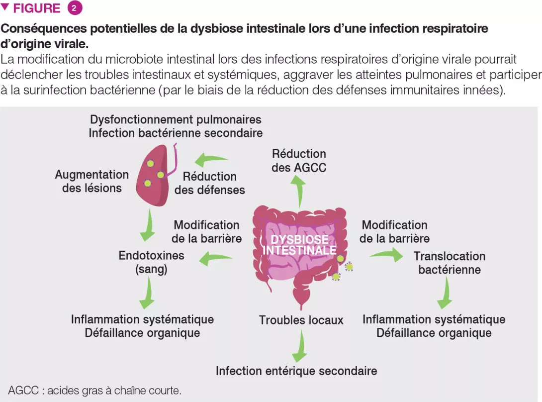 La nouvelle maladie à coronavirus 19 (COVID-19) nous rappelle que les interactions entre le microbiote intestinal et le système immun itaire sont essentielles lors des infections virales des voies respiratoires. Les virus respiratoires peuvent déclencher des symptômes gastro-intestinaux, mettant en évidence le rôle de l’axe poumon-intestin dans la maladie. Des études cliniques et l’exploitation de modèles expérimentaux indiquent que les infections respiratoires aiguës d’origine virale modifient la composition et les fonctions du microbiote intestinal. Dans cette revue, nous examinons ces changements majeurs et discutons des causes potentielles de la dysbiose intestinale induite lors d’infections respiratoires virales. Nous présentons également les conséquences de la dysbiose intestinale sur la maladie. Enfin, nous suggérons des stratégies interventionnelles visant à cibler le microbiote intestinal afin de r éduire la sévérité des maladies respiratoires d’origine virale.
