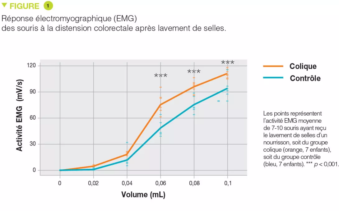 Le transfert de selles de nourrissons ayant des coliques par lavement à des souris est capable d’induire une hypersensibilité viscérale. Ceci est en faveur d’un mécanisme douloureux abdominal et de l’implication, directe ou indirecte, du microbiote intestinal dans la physiopathologie des coliques du nourrisson. Ce modèle pourrait être utilisé afin de déterminer quelles sont les voies métaboliques modifiées par une perturbation du microbiote intestinal et impliquées dans les coliques du nourrisson.