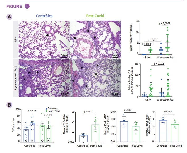 - Les souris transplantées avec les échantillons post-Covid ont présenté une inflammation au niveau des poumons et des difficultés pour gérer une infection pulmonaire par une souche multirésistante de Klebsiella pneumoniae