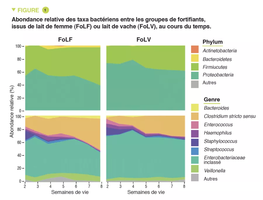 - Dans l’alimentation des nouveau-nés de très faible poids de naissance, l’utilisation de fortifiants issus du lait de femme ou du lait de vache modifie différemment la composition bactérienne du microbiote intestinal au cours des premières semaines de vie