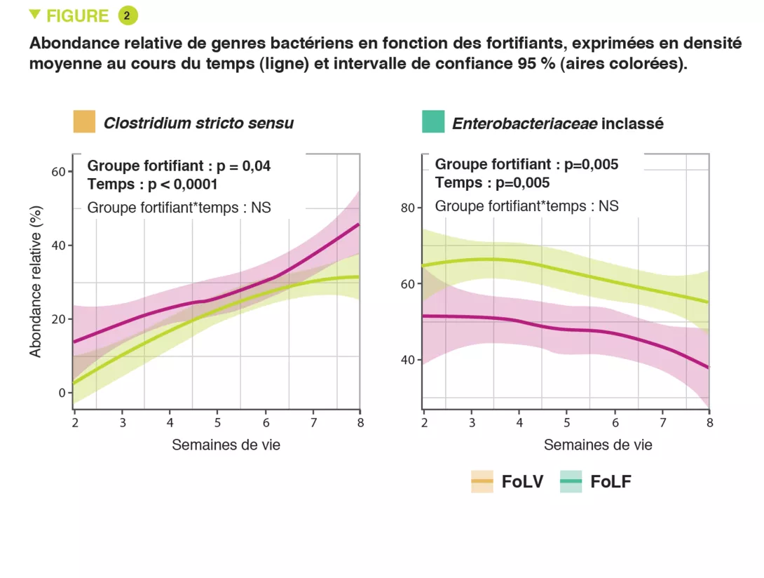 Les nouveau-nés FoLF avaient une diversité microbienne (index de Shannon) plus faible (p < 0,005). Il existe une prédominance de Proteobacteria et de Firmicutes dans les 2 groupes, avec une abondance relative plus importante de Proteobacteria (p = 0,0003) dont Enterobacteriaceae inclassé (p = 0,005) et plus faible de Firmicutes (p = 0,001) dont Clostridium stricto sensu (p = 0,04) chez FoLF que FoLV (Figure 1). L’abondance bactérienne augmentait au cours du temps régulièrement dans le groupe FoLV alors qu’elle changeait peu dans le groupe FoLF (p = 0,03). L’abondance relative de Clostridium stricto sensu (p = 0,04) était plus élevée chez les nouveau-nés FoLV par rapport aux FoLF et d’Enterobacteriaceae inclassé plus basse (p = 0,005) (Figure 2). Après normalisation de l’abondance des taxas, d’autres différences émergeaient au niveau des genres avec des concentrations plus élevées d’Eubacteriaceae inclassé (p < 0,0001), Streptococcus (p = 0,0002) et Staphylococcus (p = 0,002), et plus faibles de Clostridium stricto sensu (p = 0,04) chez les nouveau-nés FoLF par rapport aux FoLV. Ces changements d’abondance bactérienne étaient associés à des changements de fonctions microbiennes. Finalement, il était possible de prédire le type de fortifiant reçu en fonction des abondances microbiennes des selles.