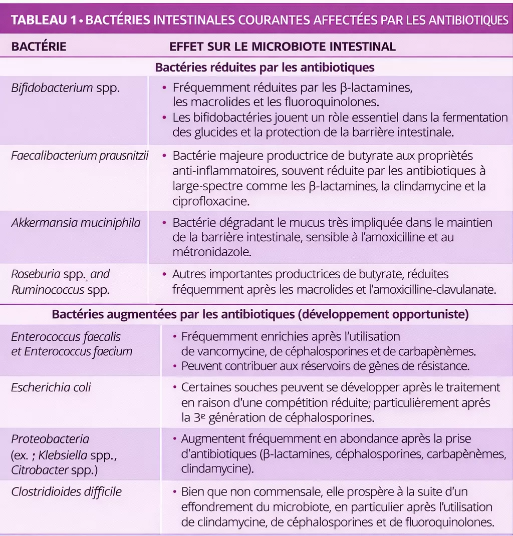 On sait que les antibiotiques perturbent le microbiote intestinal en réduisant sa diversité, en altérant sa composition et en favorisant le développement de souches résistantes (tableau 1) 5, 6. Van Zyl et al. ont montré que les antibiotiques, en particulier les quinolones et les β-lactamines, perturbent systématiquement les communautés microbiennes dans l’ensemble du corps et que les schémas thérapeutiques combinés provoquent une dysbiose prolongée et augmentent la charge pathogène 5. De même, Maier et al. ont montré que les différentes classes d’antibiotiques ont des effets distincts sur les bactéries intestinales : les macrolides et les tétracyclines entraînent des pertes marquées chez les bactéries anaérobies ; quant aux médicaments tels que l’amoxicilline ou la ceftriaxone, ils favorisent le développement des Proteobacteria. En dépit des variations individuelles, une tendance globale se dégage : la disparation des bactéries anaérobies indispensables (ex. : Firmicutes) et la prolifération de microbes non essentiels et potentiellement pathogènes 6.