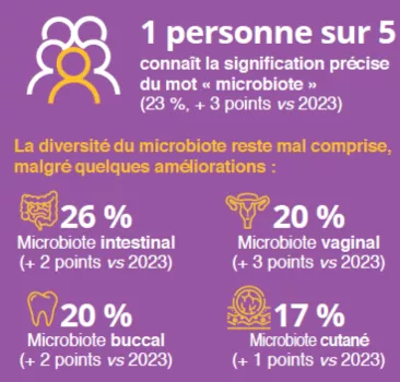 - Le rôle et les fonctions du microbiote sont aussi mieux connus par rapport à l’année dernière : 78 % savent que leur alimentation a des conséquences sur l’équilibre de leur microbiote (+2 points vs 2023).