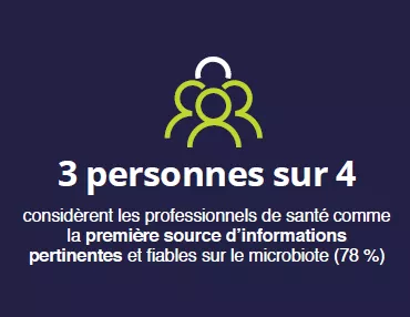 - Les professionnels de santé, l’interlocuteur le plus crédible pour transmettre l’information : plus de 3 répondants sur 4 considèrent les professionnels de santé comme la source d’information la plus fiable sur le microbiote (78 % ; première source mentionnée).