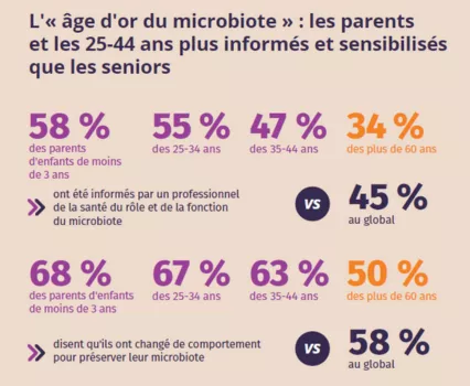- Les parents d’enfants de moins de 3 ans et les 25-44 ans sont plus sensibilisés et informés : c’est « l’âge d’or du microbiote ».