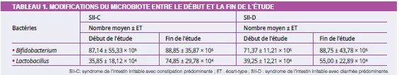 À l’inclusion, avant toute intervention symbiotique, les profils de Bifidobacterium étaient significativement différents entre le SII-C et le SII-D (87,14 ± 23,19 vs 71,37 ± 12,24 ; p = 0,02), avec des nombres plus faibles dans le SII-D. L’administration du symbiotique a eu un effet significatif sur les profils bactériens entre l’inclusion et la fin du traitement dans les deux groupes SII-C et SII-D (Tableau 1).