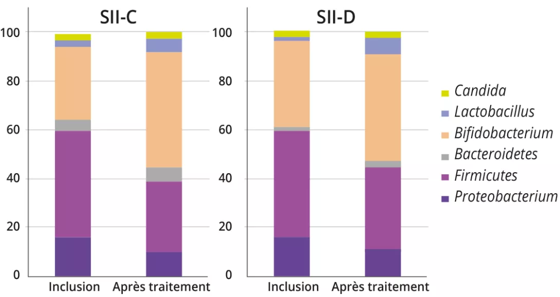 L’analyse microbienne fécale a montré une augmentation de la proportion des genres bactériens associés à des bénéfices pour la santé (p. ex. Bifidobacterium et Lactobacillus), à la fois pour le SII-C et le SII-D (SII-C : 31,1 ± 16,7 % vs 47,7 ± 13,5 %, p = 0,01 ; SII-D : 35,8 ± 16,2 % vs 44,1 ± 15,1 %, p = 0,01). À l’inverse, les genres de bactéries nocives, à savoir Escherichia, Clostridium et Klebsiella, étaient diminués après le traitement (21,3 ± 16,9 % vs 16,3 ± 9,6 %, p = 0,02). Aucune particularité n’a été observée chez les enfants atteints de DF.