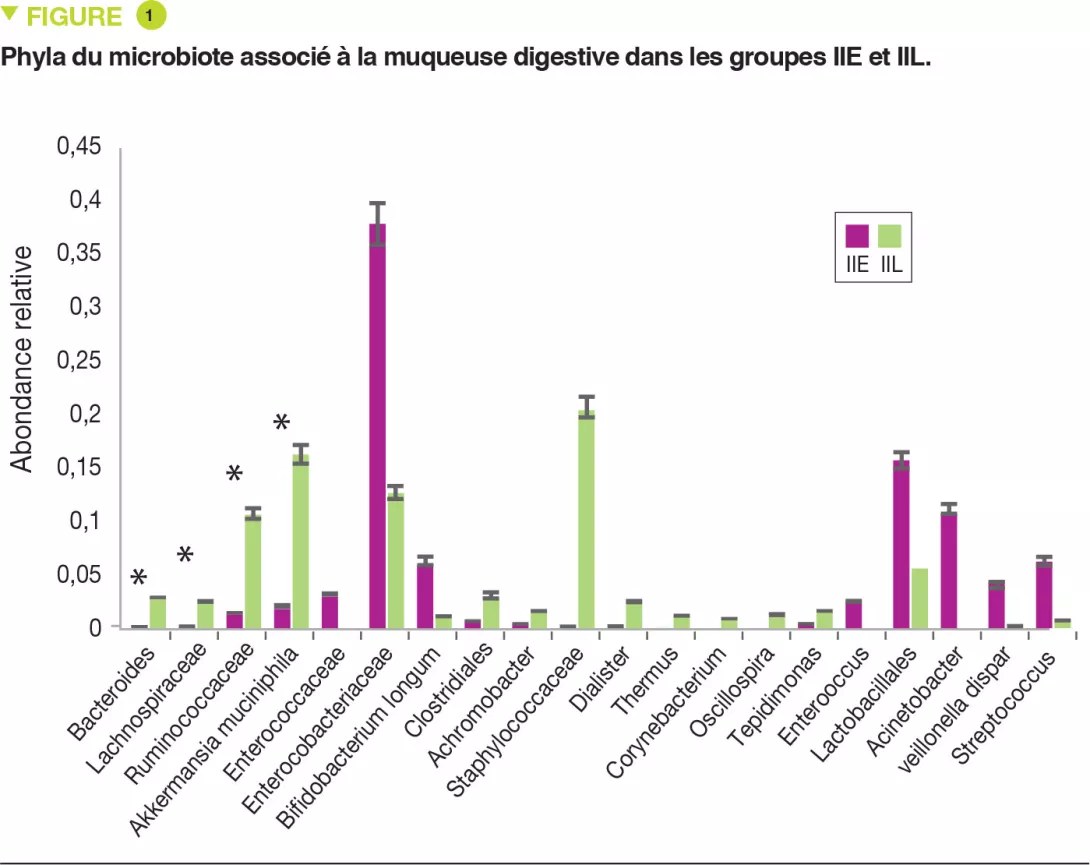 Le MF a une diversité (index de Shannon) plus faible chez les IIE que chez les IIL (p = 0,01). L’abondance relative est similaire au MM entre IIE et IIL pour les Proteobacteria et Firmicutes (p < 0,05). De même, on retrouve une distribution bactérienne avec plus d’Enterobacteriaceae chez les IIE et plus de Ruminococcaceae, Bacteroides, Lachnospiracee et Staphylococcaceae chez les IIL.