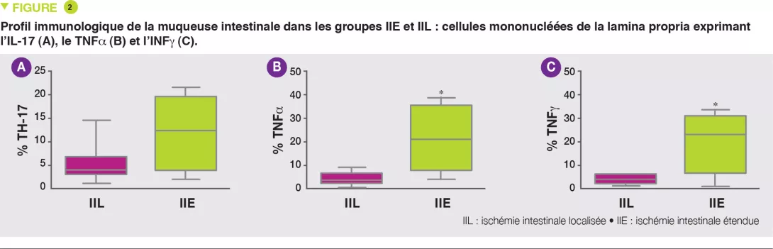 Le groupe IIE a une augmentation des lymphocytes B, T et NK (Natural Killer), notamment des lymphocytes T CD3+, TH17 (Figure 2A) et une diminution des lymphocytes T régulateurs (Tregs), avec une augmentation des cellules exprimant le TNFa (Figure 2B) et l’INFg (Figure 2C).