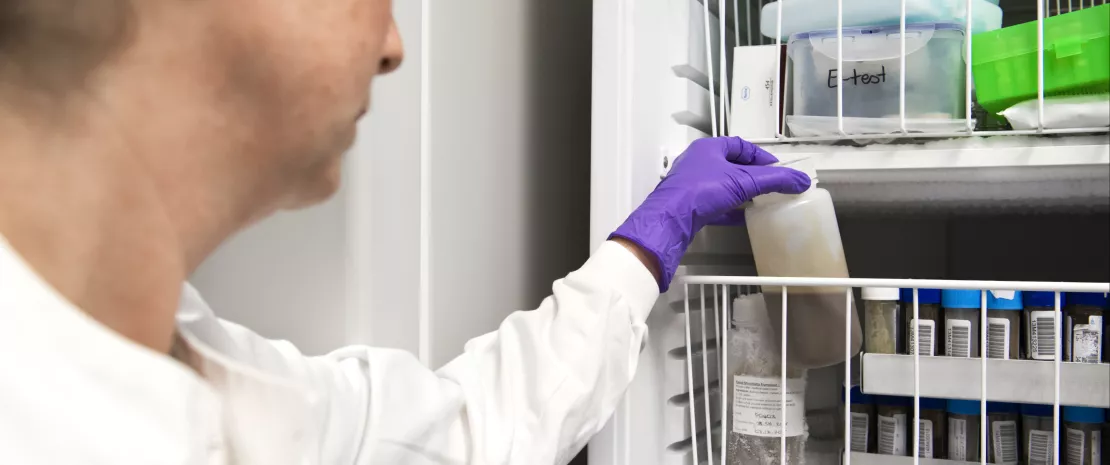Faecal transplant preparation. A technician storing a prepared sample of human faecal matter in cold storage.