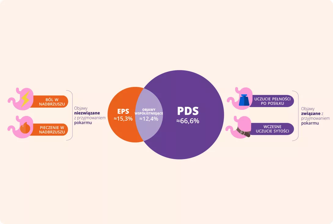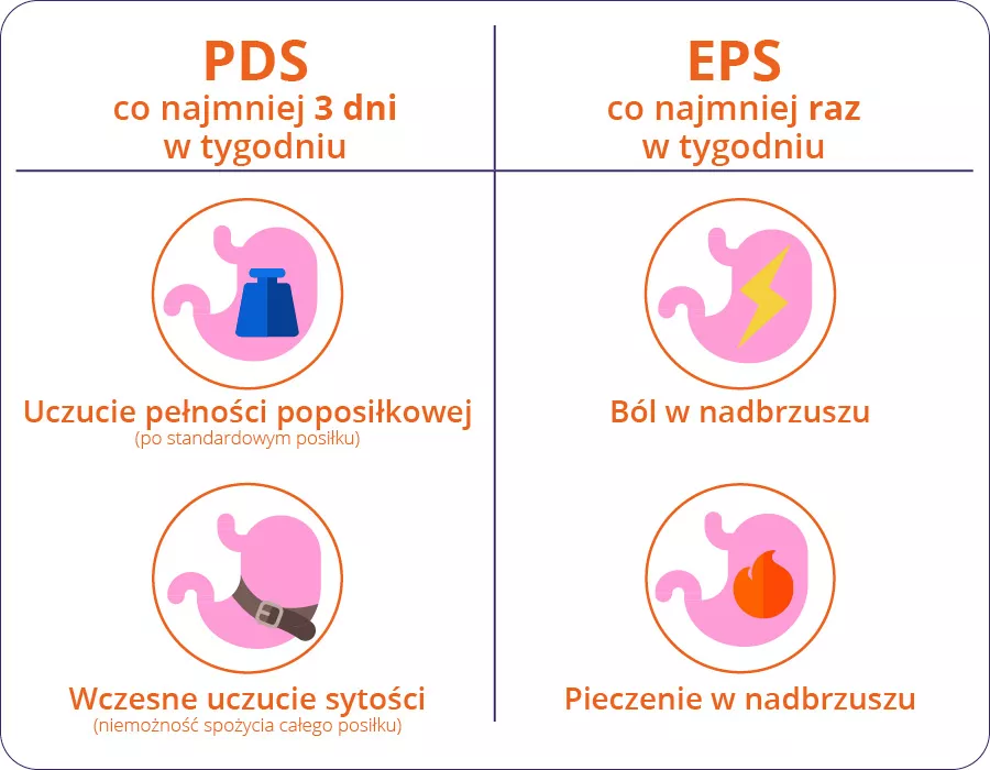 - Zespół dolegliwości poposiłkowych (PDS), który charakteryzuje się objawami wywołanymi posiłkiem,