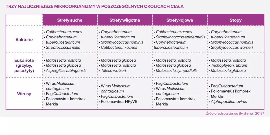 Obszary te to nisze ekologiczne sprzyjające rozwojowi unikatowej społeczności mikroorganizmów. Strefy najbardziej eksponowane i suche, takie jak dłonie, są najbardziej zróżnicowane. Mikrobiota skóry wilgotnych, bogatych w pot pach jest zdominowana przez rodzaje Corynebacterium i Staphylococcus, natomiast okolice bogate w lipidy – takie jak twarz – zasiedla mikrobiota znacznie mniej urozmaicona (bakterie Cutibacterium, grzyby z rodzaju Malassezia, roztoczDemodex folliculorum).3