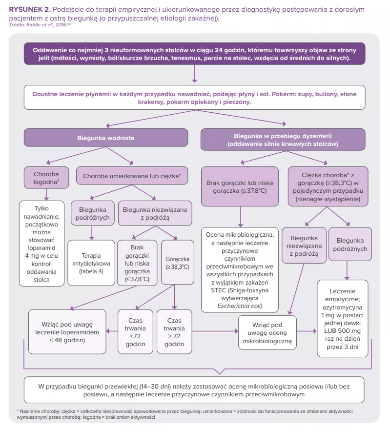 Większość infekcji jelitowych u osób niedotkniętych ubytkami odporności mija samoistnie. Niemniej niektórzy pacjenci (silnie odwodnieni, poważniej chorzy, z przewlekłą gorączką, krwawymi stolcami, zniesioną odpornością itp.) wymagają konkretnych badań diagnostycznych. Mogą one obejmować pełną morfologię krwi, oznaczenie poziomu kreatyniny i elektrolitów, weryfikację obecności leukocytów i laktoferyny w stolcu, posiew ze stolca z badaniem w kierunku C. difficile, PCR, badanie w kierunku jaj i pasożytów, endoskopię i obrazowe badania brzucha11. Wytyczna Amerykańskiego Kolegium Gastroenterologii (ACG)12 zawiera zalecenia w zakresie diagnostyki i postępowania z dorosłymi pacjentami z ostrą biegunką pochodzenia przypuszczalnie zakaźnego (rysunek 2). Badania kliniczne dzieci są oparte na tych samych zasadach 23. W 2023 r. w globalnych wytycznych Światowej Organizacji Gastroenterologicznej (WGO) uwzględniono probiotyki w zapobieganiu i leczeniu niektórych biegunek zakaźnych 57.