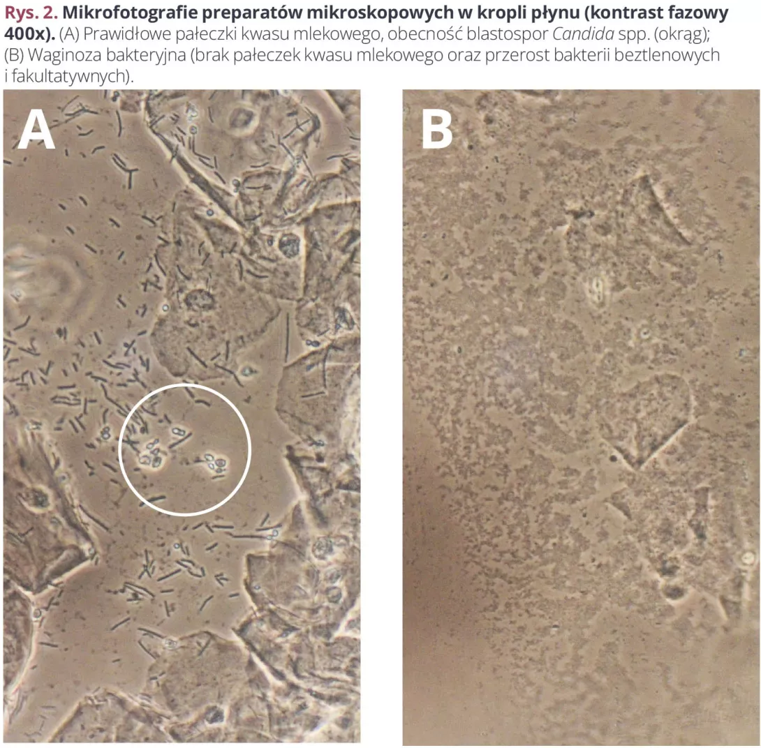 (A) Prawidłowe pałeczki kwasu mlekowego, obecność blastospor Candida spp. (okrąg); (B) Waginoza bakteryjna (brak pałeczek kwasu mlekowego oraz przerost bakterii beztlenowych i fakultatywnych).