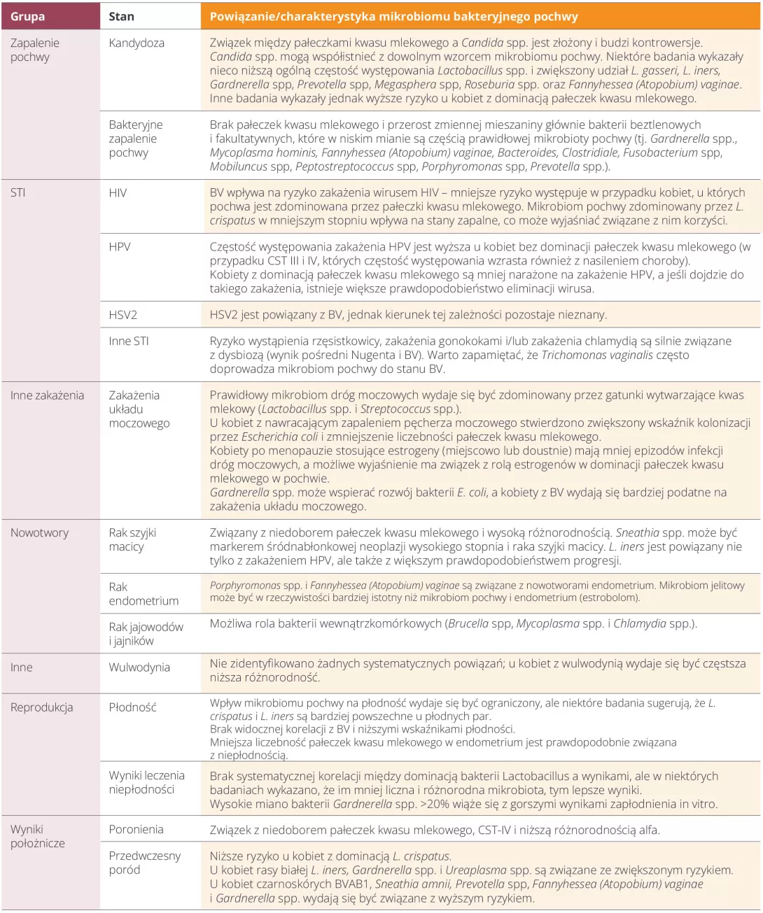 Tabela 1. Problemy ginekologiczne i położnicze oraz ich powiązania z mikrobiomem sromu i pochwy
