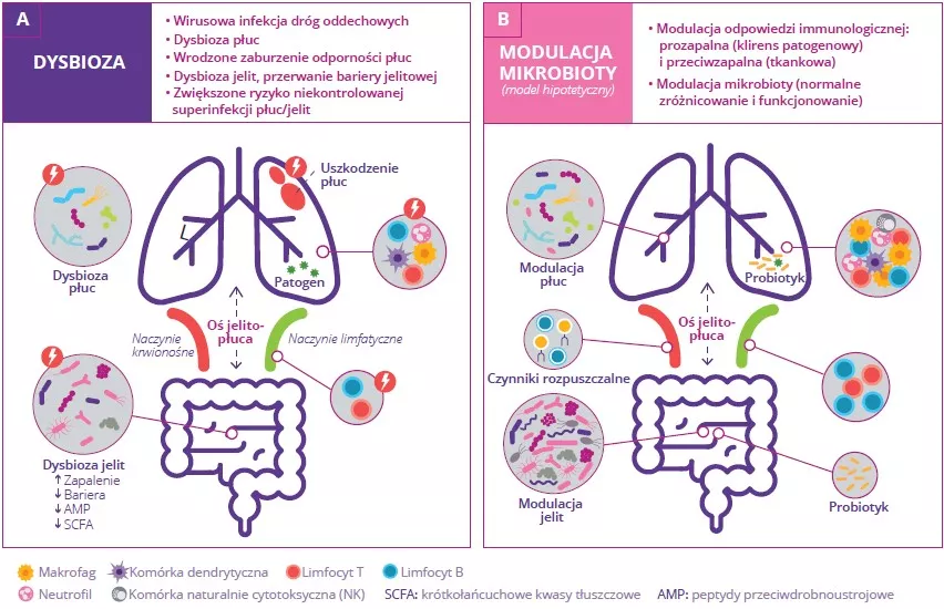 RYSUNEK 7: Oś jelito-płuca podczas wirusowej infekcji dróg oddechowych (A) i model modulacji mikrobioty przy użyciu probiotyków (B).