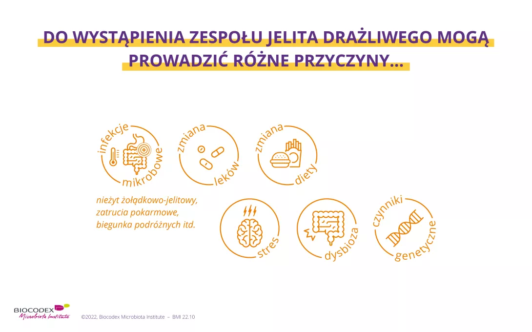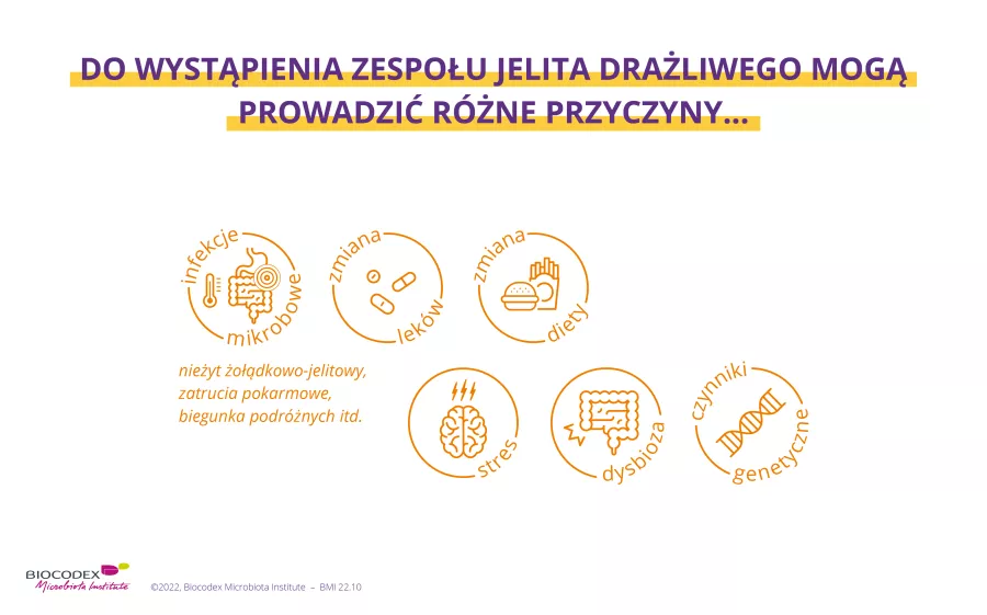 Przyczyny zespołu jelita drażliwego są złożone i nadal są tylko częściowo rozumiane. Uważa się, że wystąpienie IBS jest wynikiem kombinacji czynników o różnym charakterze i znaczeniu w zależności od danej osoby 2: predyspozycje genetyczne, pewne wcześniejsze choroby i leczenie, stres, dieta itp.