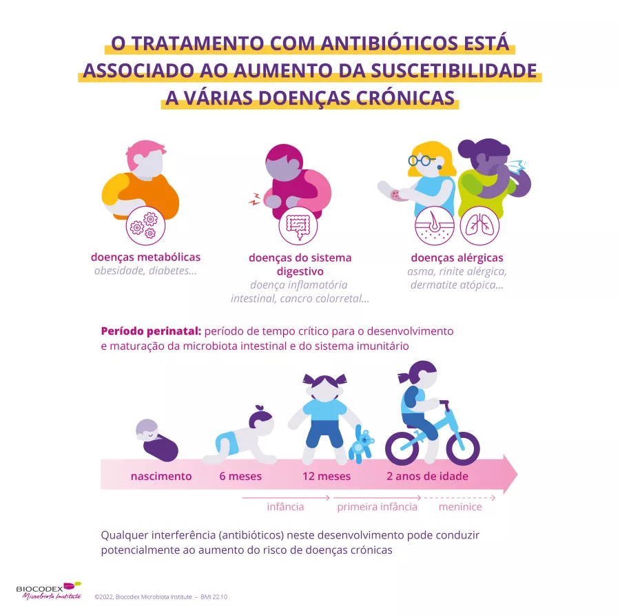 A exposição precoce ou repetida a antibióticos pode ter um efeito duradouro na composição da microbiota e aumentar o risco de distúrbios imunológicos, digestivos ou alérgicos. Os seus efeitos nem sempre cessam no final do tratamento. A sua influência na microbiota pode deixar marcas significativas na nossa saúde. Esses distúrbios lembram-nos da importância do uso sensato para proteger a nossa saúde a longo prazo e limitar os desequilíbrios na microbiota, conhecidos como disbiose (link para a página sobre disbiose).