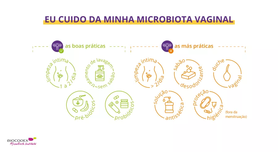 Relativamente à microbiota vaginal, evitar lavar a vulva com sabão e antissépticos, nunca lavar a vagina com perfumes ou detergentes, uma vez que ela se limpa a si própria através da sua descarga contínua. Lavar com água morna ou com produtos de higiene íntima sem perfume e sem sabão. Usar um óleo vegetal neutro para manter lubrificadas as mucosas sensíveis da vulva. Praticar sexo seguro e, se sentir a vagina seca, utilizar lubrificantes quando tiver relações sexuais e pensar num tratamento local com um creme contendo estrogénio.