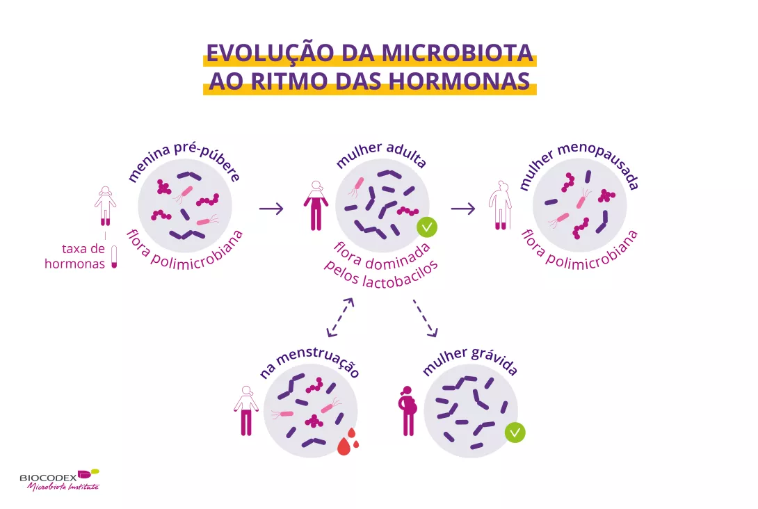 A composição da microbiota vaginal é influenciada pelo estrogénio, que promove a proliferação das células epiteliais vaginais e aumenta o armazenamento de glicogénio, principal nutriente para o crescimento dos lactobacilos. Com a diminuição dos níveis de estrogénio durante a perimenopausa, a diversidade da microbiota vaginal aumenta, enquanto os lactobacilos diminuem1,2.
