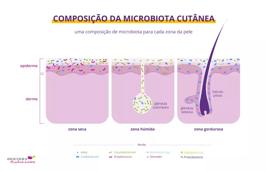 Cada uma dessas zonas da pele aloja uma microbiota diferente, adaptada ao seu ambiente específico.1Alguns investigadores fazem ainda a distinção de um quarto local nos pés (unhas, calcanhar e espaço entre os dedos).1
