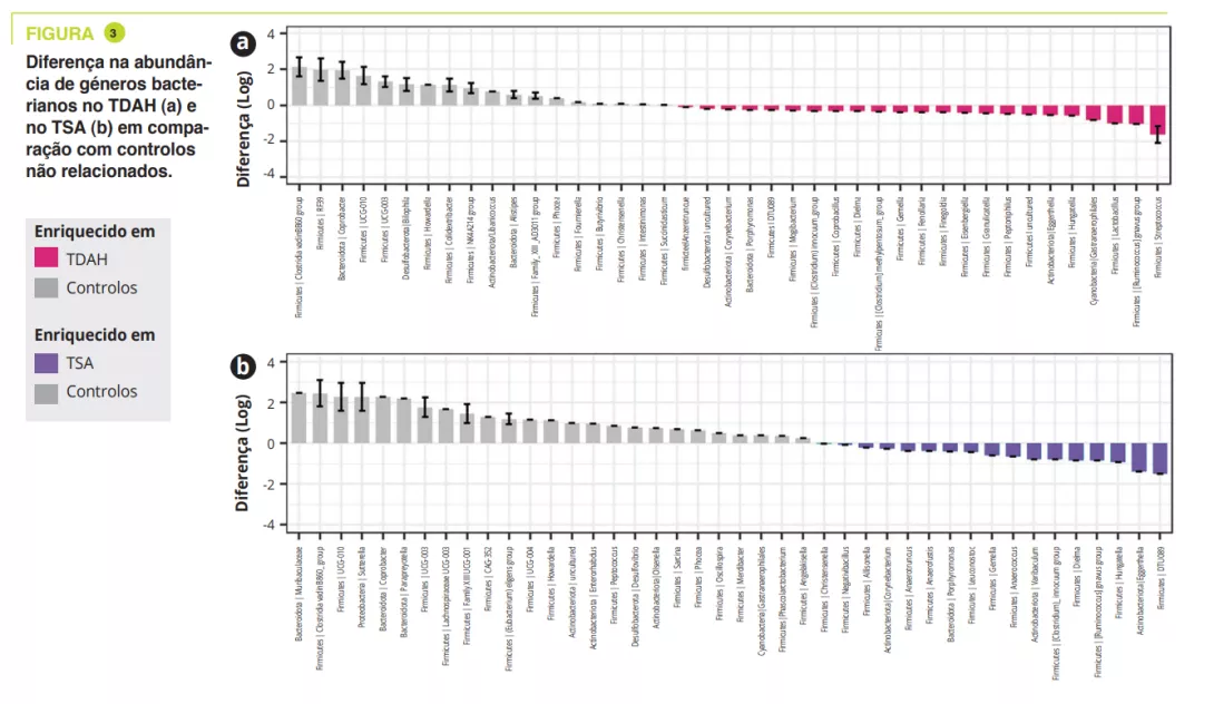 As crianças e adolescentes com TDAH e TSA têm uma microbiota intestinal semelhante, mas diferente dos controlos não relacionados. Além disso, as variações na diversidade beta da microbiota intestinal, bem como um aumento da lombalgia, foram associadas a diferenças entre moléculas pró-inflamatórias e anti-inflamatórias a nível sistémico.