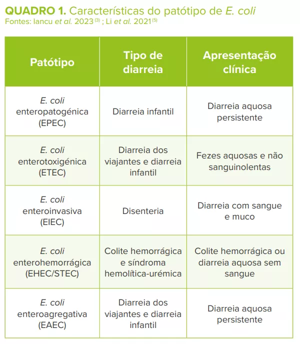 Diferentes estirpes patogénicas de E. coli, classificadas em diferentes patotipos (Quadro 1), causam diarreia ligeira a grave, normalmente acompanhada de febre. A E. coli adere às células epiteliais intestinais através das fímbrias de adesão, produz toxinas e exerce os seus efeitos patogénicos3,5