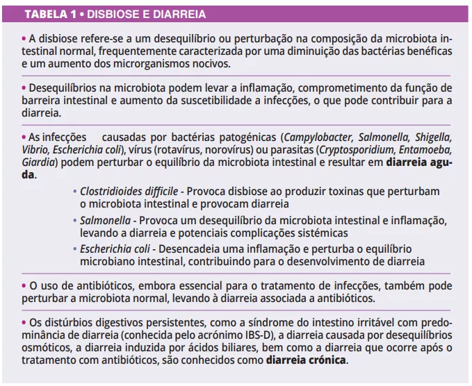 Os distúrbios intestinais podem manifestar sintomas como fezes frequentes e soltas, conhecidas como diarreia. Este sinal do sistema digestivo pode ocorrer por diversas razões, desde infeções e reações a determinados alimentos até reações adversas a medicamentos e condições de saúde pré-existentes - resumidas em [1]. A microbiota intestinal, ou seja, a totalidade dos microrganismos presentes no intestino, é essencial para a preservação da saúde digestiva e pelo seu impacto no funcionamento do intestino. Estudos recentes ilustram a relação entre a microbiota e a diarreia de etiologia diversa. Uma microbiota equilibrado e diversificado é vital para a saúde digestiva global, a absorção de nutrientes e a regulação do sistema imunitário. Atualmente, existe uma tendência para a introdução em larga escala de formas de reprogramar a comunidade microbiana intestinal: pré-bióticos, probióticos e pós-bióticos ou o transplante de matéria fecal para prevenir ou tratar a diarreia. A investigação sobre a modulação da microbiota oferecerá, num futuro próximo, estratégias acionáveis para a prevenção e o tratamento da diarreia. A visão geral que se segue abrange as principais doenças diarreicas relacionadas com a disbiose e alguns aspetos relativos à gestão da microbiota para melhorar estas afeções gastrointestinais.