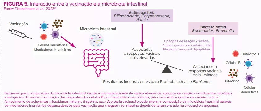 Desde a sua introdução em 2006, as vacinas orais contra o rotavírus (ORVV) provocaram, a nível mundial, uma descida significativa do número de hospitalizações e de mortes devidas à diarreia por rotavírus.30 No entanto, a eficácia das vacinas tem sido variável, com os países de baixo nível de rendimentos a registarem um desempenho inferior em comparação com a eficácia notavelmente elevada (>90%) observada nos países de rendimento mais elevado.31 Pensa-se que as razões para esta disparidade são multifatoriais (imunidade do hospedeiro, parâmetros perinatais, genética, estado nutricional, stress, consumo de tabaco e álcool, localização rural versus urbana, dimensão da família, etc.). Tal como acontece com outras vacinas, a composição e a função da microbiota intestinal são consideradas um fator fundamental que regula a resposta imunitária à vacinação30,32,33 (Figura 5).