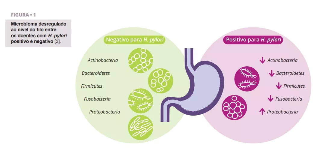 Schulz et al. analisaram as diferenças na composição da microbiota entre pacientes infetados por H. pylori e pacientes negativos para H. pylori. Observaram uma diferença significativa na abundância relativa de Proteobactérias, que eram mais prevalentes nos aspirados de pacientes infetados com H. pylori. Outros filos apresentaram uma abundância relativa mais baixa (figura 1) 3