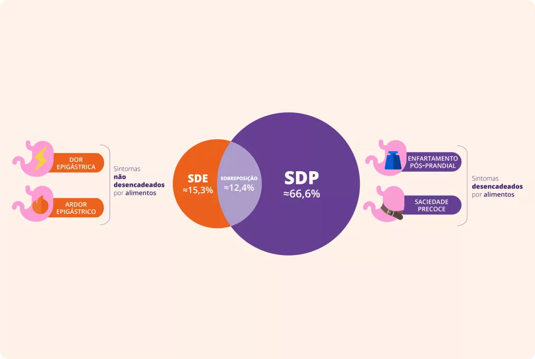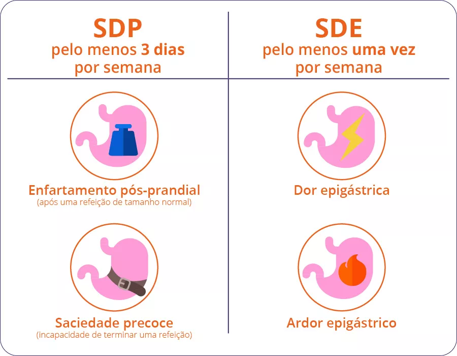- Síndrome do desconforto pós-prandial (SDP), que se caracteriza por sintomas induzidos pela refeição,