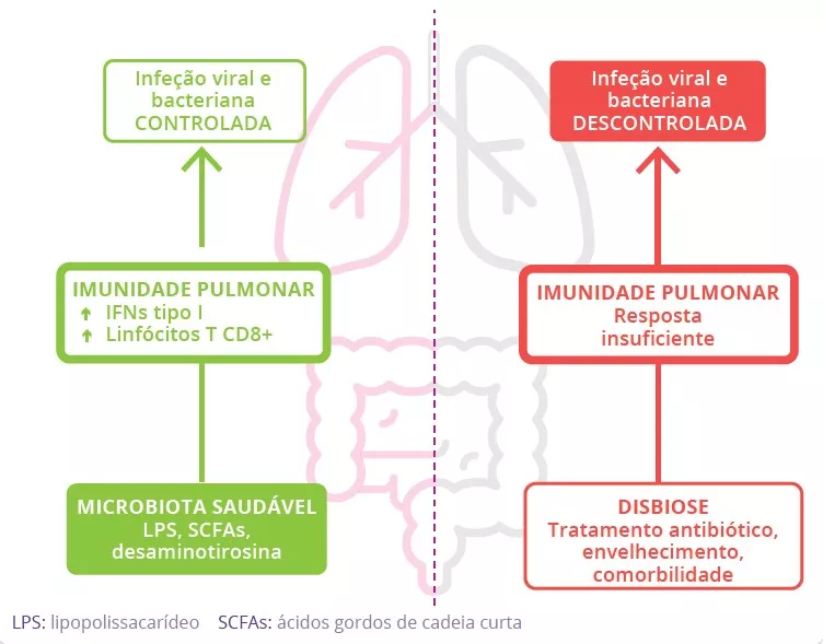 A microbiota desempenha um papel fundamental no desenvolvimento, treino e funcionamento do sistema imunitário, tanto a nível local como sistémico. Embora a microbiota das vias aéreas regule localmente a função imunitária, a microbiota intestinal pode também influenciar a imunidade respiratória, através do eixo intestino-pulmão.1 Têm-se observado alterações das microbiotas pulmonar e intestinal em muitas doenças respiratórias, não tendo, contudo, sido possível determinar ainda se a disbiose desses locais surge como causa ou consequência da doença.2 A alteração da composição da microbiota intestinal devido à dieta, ao uso de antibióticos, ao envelhecimento ou a doença, encontrase associada a respostas imunitárias alteradas e homeostase das vias aéreas,3 revelando que a microbiota intestinal pode influenciar o desenvolvimento de doenças em todo o corpo, inclusivamente quanto ao risco de infeções respiratórias (figura 6).4