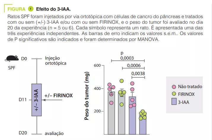 A microbiota intestinal tem um efeito sobre a resposta à quimioterapia. Entre os mecanismos envolvidos, este estudo demonstra o papel dos metabolitos microbianos, particularmente os metabolitos do triptofano. Entre estes, o 3-IAA não só é um marcador preditivo da resposta à quimioterapia no PDAC, como também pode representar uma molécula terapêutica adjuvante.