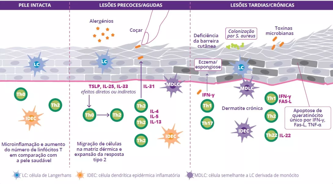 A alteração da barreira cutânea é o ponto de partida para uma disbiose da microbiota da pele caracterizada pela redução da diversidade bacteriana e pela proliferação de Staphylococcus aureus. A penetração de alergénios leva à ativação dos queratinócitos e à produção de interleucina (IL-33, IL-25, TSLP), resultando na diferenciação dos linfócitos Th2. Estes, por sua vez, segregam citocinas pró-inflamatórias (IL-4, IL-5 e IL-13) caraterísticas da inflamação de Tipo 2 (figura 9). Estas citocinas ativam diretamente os nervos sensoriais, provocando prurido.