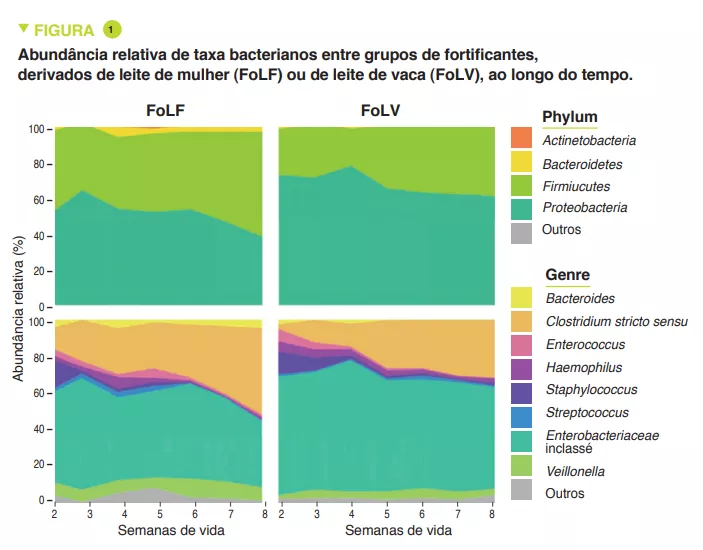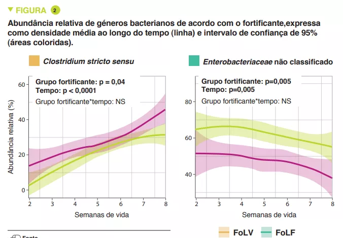 Os recém-nascidos FoLF apresentaram menor diversidade microbiana (índice de Shannon) (p < 0,005). Proteobactérias e Firmicutes predominaram em ambos os grupos, com uma maior abundância relativa de Proteobactérias (p = 0,0003) incluindo Enterobacteriaceae sem classificação (p = 0,005) e uma menor abundância relativa de Firmicutes (p = 0,001) incluindo Clostridium stricto sensu (p = 0,04) em FoLF do que FoLV (Figura 1). A abundância bacteriana aumentou de forma constante ao longo do tempo no grupo FoLV, ao passo que se alterou pouco no grupo FoLF (p = 0,03). A abundância relativa de Clostridium stricto sensu (p = 0,04) foi maior nos recém-nascidos FoLV do que nos FoLF e a de Enterobacteriaceae sem classificação menor (p = 0,005) (Figura 2). Após a normalização da abundância dos taxa, surgiram mais diferenças ao nível do género, com concentrações mais elevadas de Eubacteriaceae sem classificação (p < 0,0001), Streptococcus (p = 0,0002) e Staphylococcus (p = 0,002), e mais baixas de Clostridium stricto sensu (p = 0,04) em recém-nascidos FoLF em comparação com FoLV. Estas alterações na abundância bacteriana estavam associadas a alterações na função microbiana. Por último, foi possível prever o tipo de fortificante recebido com base na abundância microbiana das fezes.