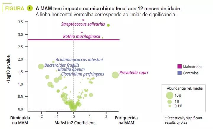 A MAM foi associada a uma diversidade alfa bacteriana diminuída (Shannon), a uma prevalência e abundância aumentadas de Rothia mucilaginosa e Streptococcus salivarius (figura 1) e a uma relação Bacteroidetes/Firmicutes aumentada. As análises funcionais do MI não apresentaram diferenças.