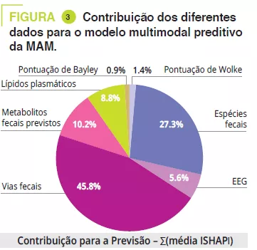 A integração de dados multimodais demonstrou que os melhores preditores de MAM aos 12 meses foram: 1) os lípidos plasmáticos (AUROC = 0,95 ± 0,05); 2) as medidas cerebrais e comportamentais (pontuação de Wolke, EEG, pontuação de Bayley) (AUROC = 0,73 ± 0,05, 0,71 ± 0,10, 0,68 ± 0,07, respetivamente); 3) o perfi l taxonómico, funcional e dos metabolitos previstos do microbioma fecal (AUROC = 0,56 ± 0,07, 0,53 ± 0,07, 0,52 ± 0,06). De notar a importância dos dados relacionados com o microbioma fecal para prever a MAM na análise multimodal, apesar do baixo desempenho do microbioma fecal (figura 3).